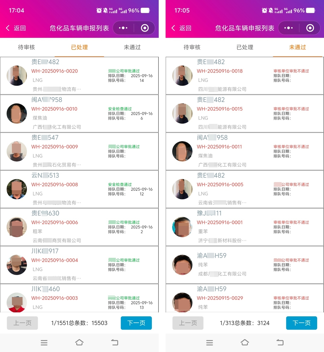 客戶單位管理人員擁有審核權(quán)限,可通過電腦端或微信小程序查看、審批司機(jī)提交的材料,司機(jī)通過微信小程序?qū)崟r(shí)查看審核狀態(tài),接收駁回原因與補(bǔ)交提醒。通過電腦端與微信小程序的協(xié)同,構(gòu)建“司機(jī)便捷提交—管理人員高效審核—狀態(tài)實(shí)時(shí)同步”的閉環(huán)流程,兼顧安全性與易用性,提升廠內(nèi)人員審核效率。